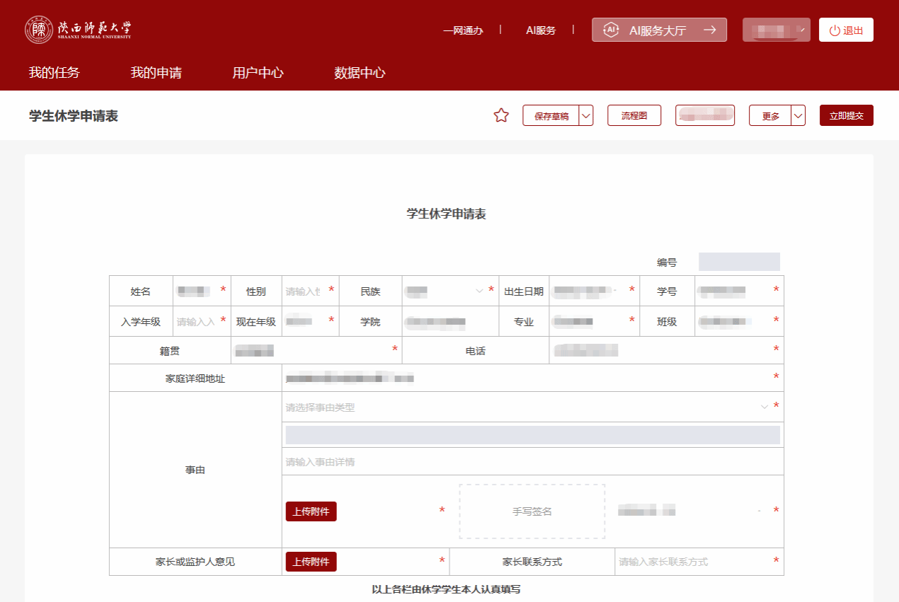 通过上述任一入口登录系统后,在线填报《学生休学申请表》。