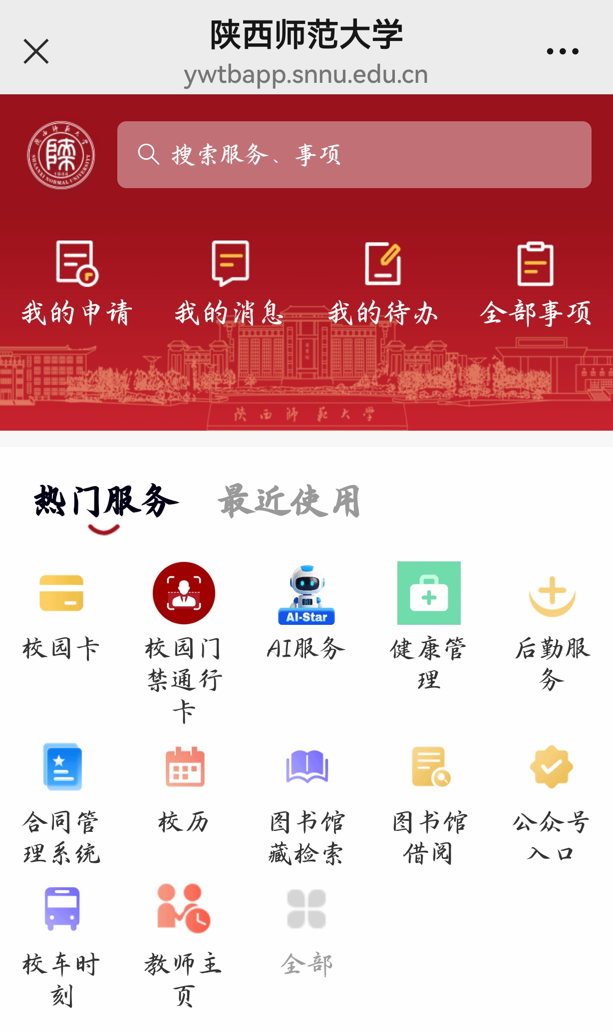 ① 使用微信搜索“陕西师范大学一网通办”,进入首页。