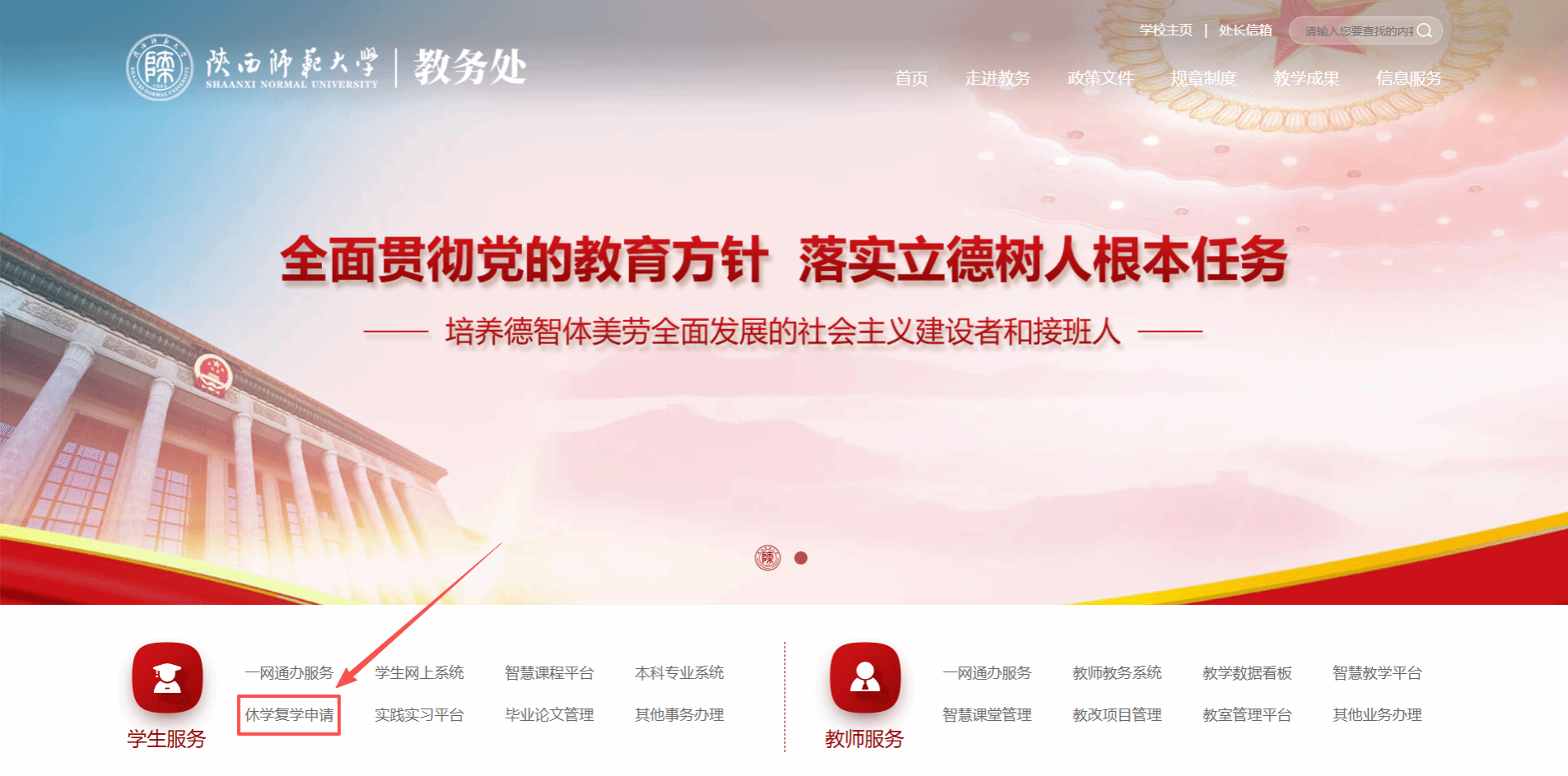 ① 访问陕西师范大学教务处官网,于首页“学生服务”功能区点击“休学复学申请”。