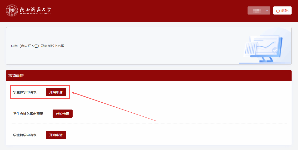 ③ 选择“学生休学申请表”,点击“开始申请”。