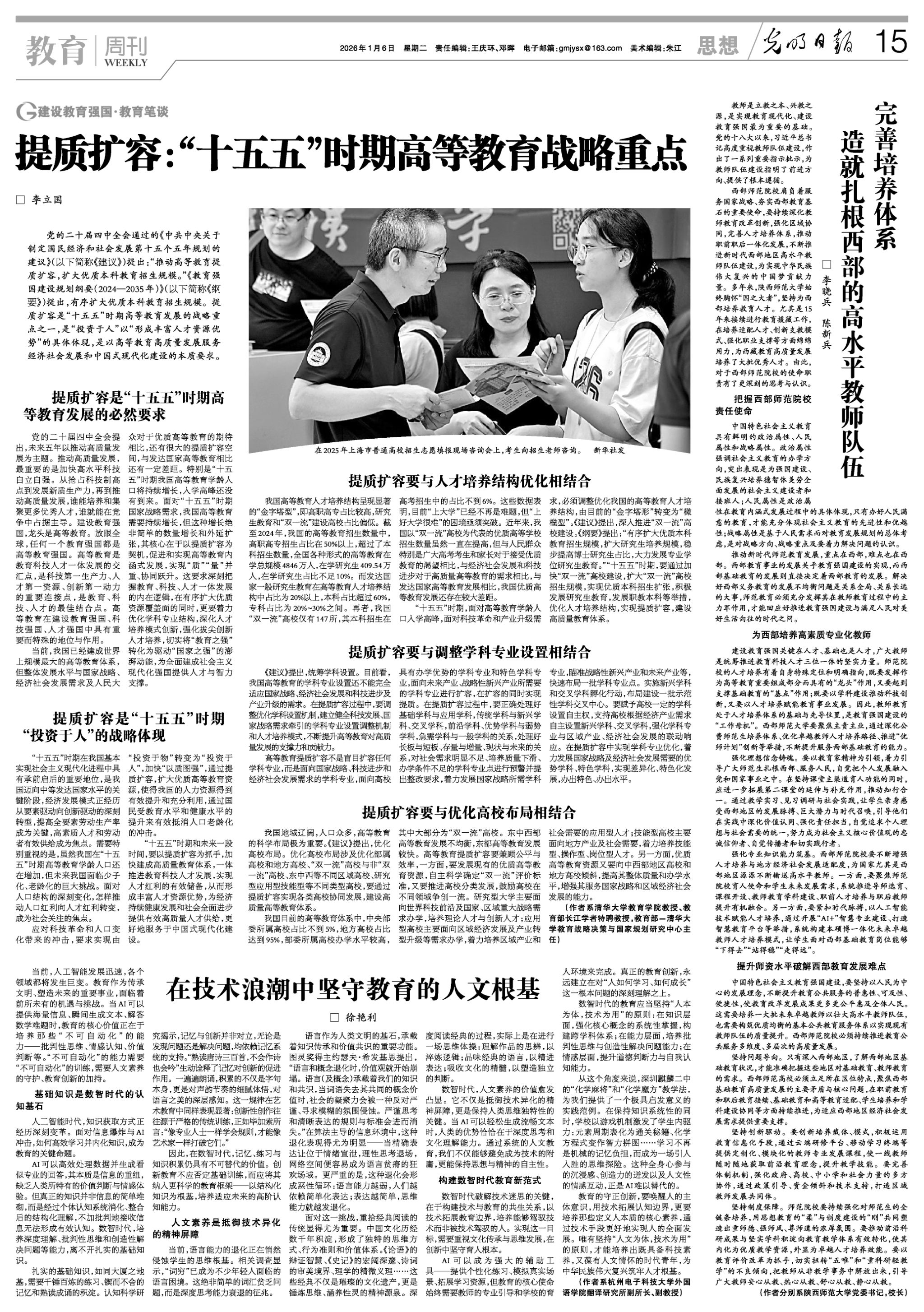 1月6日,《光明日报》刊发我校党委书记李晓兵、校长陈新兵的署名文章“完善培养体系 造就扎根西部的高水平教师队伍”。文章从“把握西部师范院校责任使命”“为西部培养高素质专业化教师”“提升师资水平破解西部教育发展难点”等三个层面,深刻阐释了西部师范院校在造就扎根西部的高水平教师队伍方面的使命职责,充分彰显了我校始终胸怀“国之大者”,坚持为西部培养教育人才,尤其是15年来接续进行教育援藏工作,在培养适配人才、创新支教模式、强化职业支撑等方面绵绵用力,为西藏教育高质量发展培养大批优秀人才的时代担当。